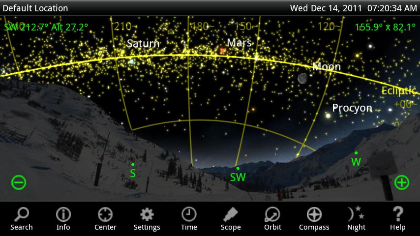 If you have an Android device with a compass, SkySafari Pro can help you identify stars and planets by holding your phone next to them. Tap the Compass button (or tilt your phone up toward the sky) to activate the compass. Now, as you move the phone around, the sky chart follows your motion. Search for any object in the sky, and follow the arrow on screen to find it!