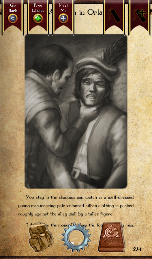 Occasionally you will be presented with a situation that needs to be resolved with some dice rolling. The gamebook engine lets you throw 3D physics based dice that roll and bounce as if you were tossing them on a tabletop. Roll the dice to resolve combat by pitting your character against a myriad of enemies. Roll the dice to see if you were able to leap the gaping chasm, or pick the shopkeep’s pockets. Roll the dice to see if you won a bet, or caught the plague!